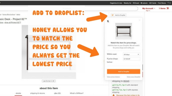 Another benefit Honey can offer you is through a program called “Droplist”. Droplist is a feature from Honey that helps you make sure you don’t miss out on savings if you’re not quite ready to buy yet. Here’s how it works: